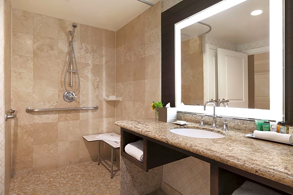 Equipped with cable TV, a safety deposit box, a refrigerator and a coffeemaker, this disability friendly room features an private bathroom with roll-in shower.